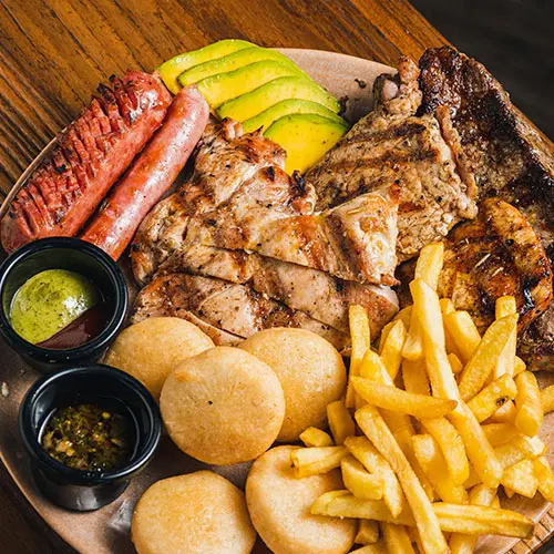 250 gr de solomo importado chorizo 180gr de papas y salsas. Envase incluido 1$. Los platos no tienen el IVA agregado