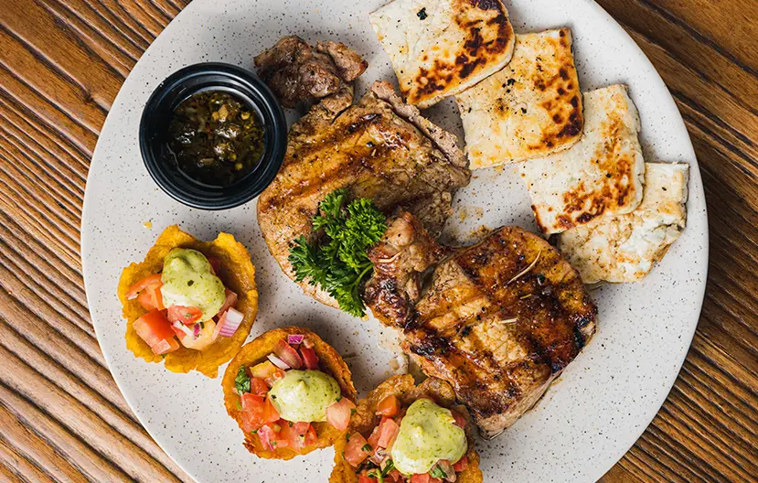 250g de Pollo acompañado de platano a la parrilla, Ensalada Cesar y Chimichurri. Envase incluido 1$. Los platos no tienen el IVA agregado
